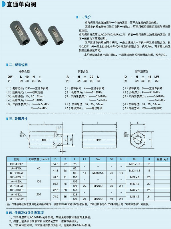 直通單向閥技術(shù)參數(shù)